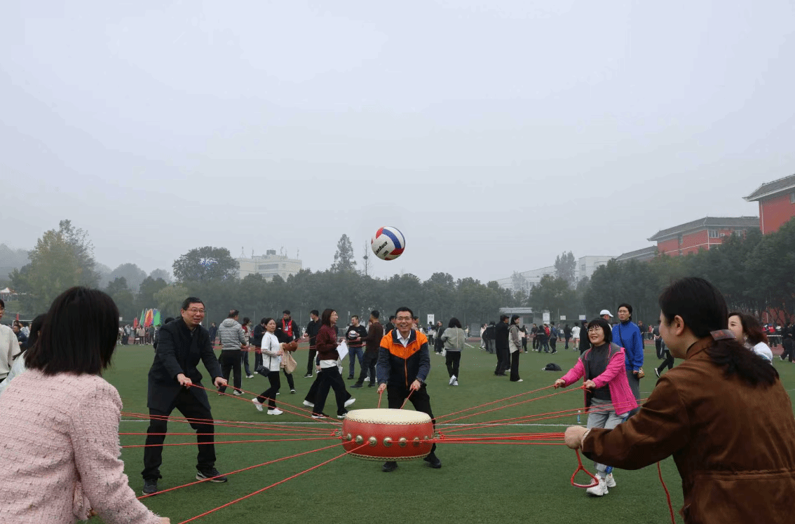运动场上,各二级工会队伍精神抖擞,以饱满热情共赴这场一年一度的体育盛会。击鼓颠球项目率先点燃赛场,击鼓颠球考验精准协作,十余名教师牵绳控鼓,目光聚焦排球起落,每一次颠起都是团队默契的见证。